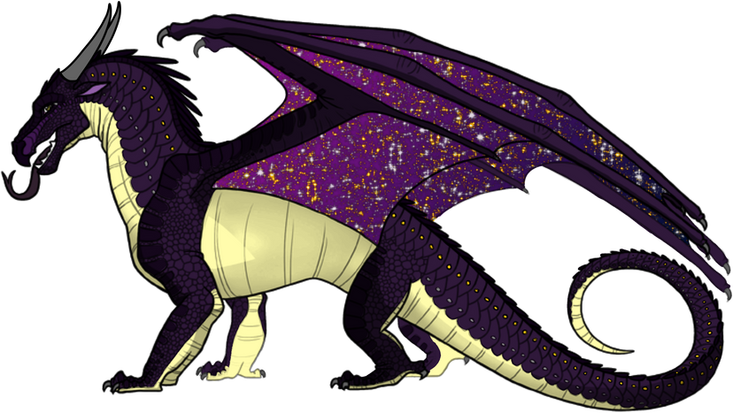 Appearance: Stargazer has bright yellow eyes with silver teardrop scales behind them, but she normally covers these scales with dust to hide them. She's small, but a lot healthier and spunkier than most NightWings are. Her scales are a very dark shade of purple, and her underscales are yellow-ish. Her wing membrane is a gradient of navy blue & dark purple, and some of the scales scattered under her wings are gold-colored rather than silver.